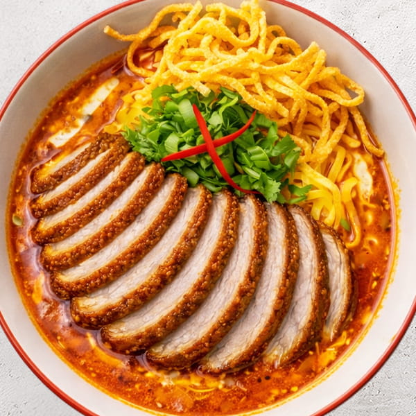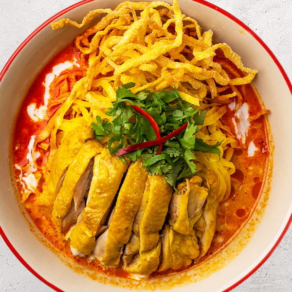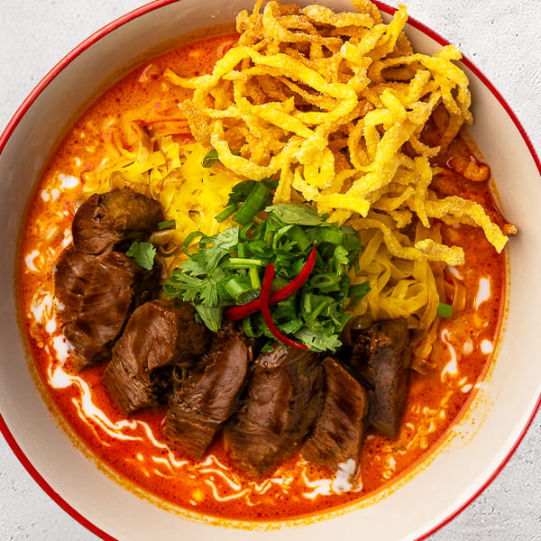 لحم بقري مطهو ببطء في مرق كاري تايلاندي شمالي ناعم، يُقدم مع نودلز البيض الطرية، ويُزين بنودلز مقلية مقرمشة. يُقدم مع الليمون، والخردل المخلل، والبصل الأحمر لإضفاء نكهة منعشة.