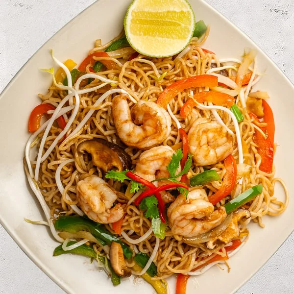 Rice noodles with choice of meat or vegetables, stir fried in sweet tamarind sauce, tofu, dried shrimp and garnished with bean sprouts and roasted peanuts