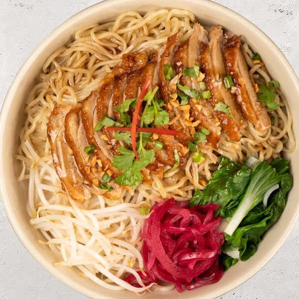 نودلز أرز عريضة مع اللحم أو الخضار مقلية بصلصة الصويا والثوم والفلفل الحار والريحان التايلاندي