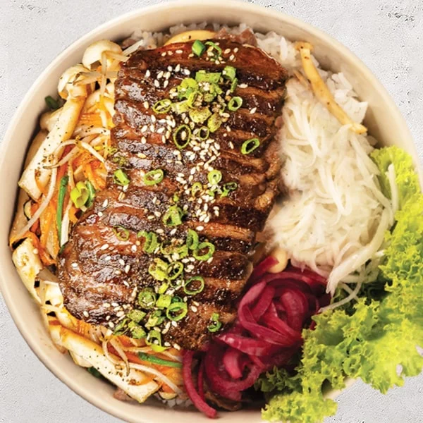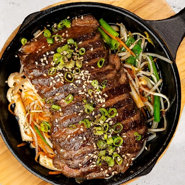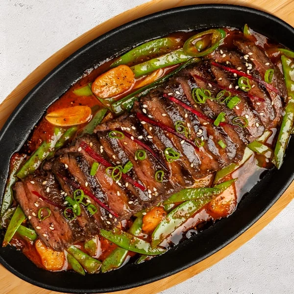 شرائح ستيك بقر أسترالي مقلية بصلصة بولغوجي مع كستناء الماء وبازلاء الثلج