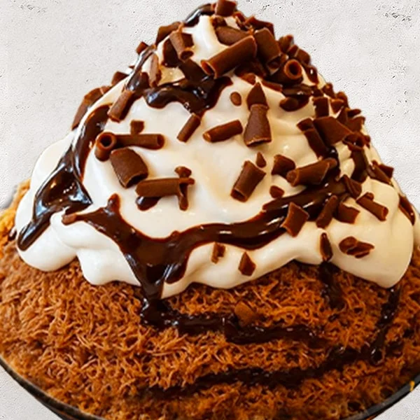 Finely shaved chocolate flavored ice with fresh chocolate curls