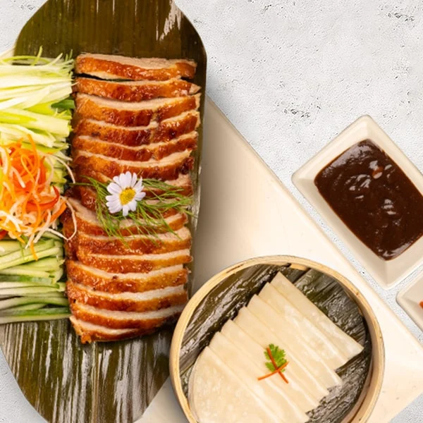 شرائح بط بكين المقرمشة تُقدّم مع الخيار والبصل الأخضر وبان كيك مع صلصة الهويسن