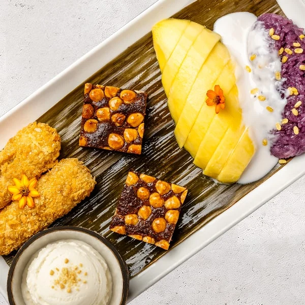 طبق من المانجو مع الأرز اللزج الحلو وبراوني البندق وموز مقلي مع آيس كريم جوز الهند