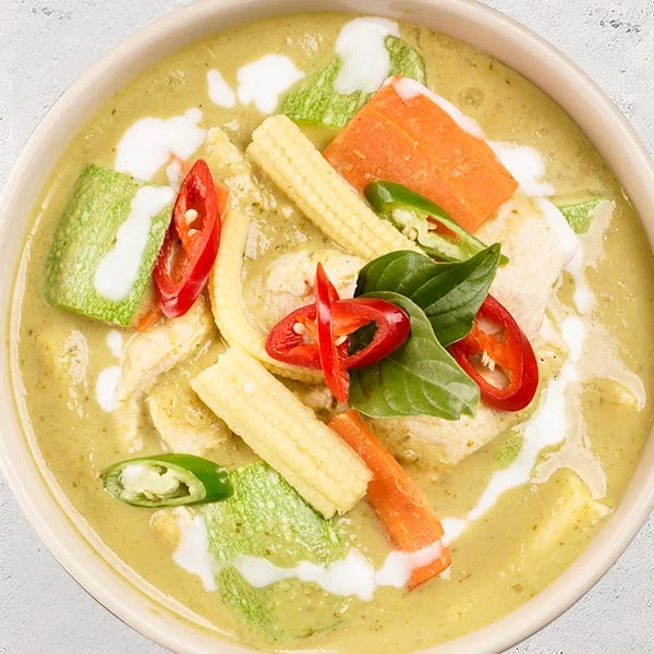 اختيارك من اللحم أو الخضارمطهو في كاري أخضر كلاسيكي مع الكوسة الصغيرة والفلفل وأوراق اللايم والريحان الحلو