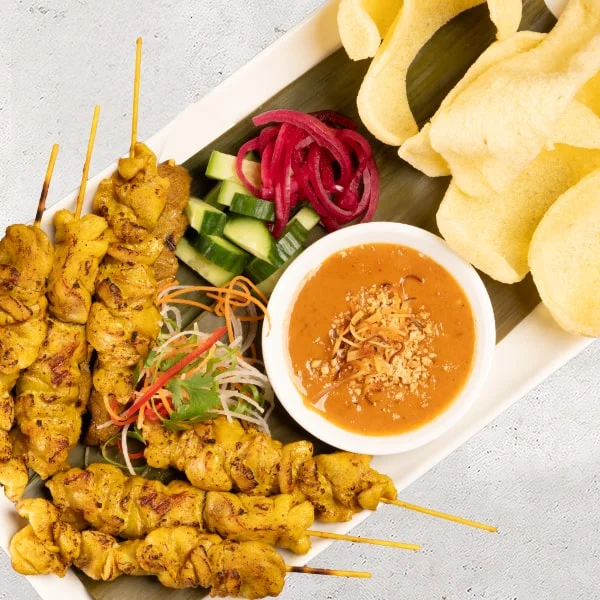 أسياخ دجاج متبلة ومشوية تُقدّم مع صلصة الفول السوداني وكرات القرع المقرمشة