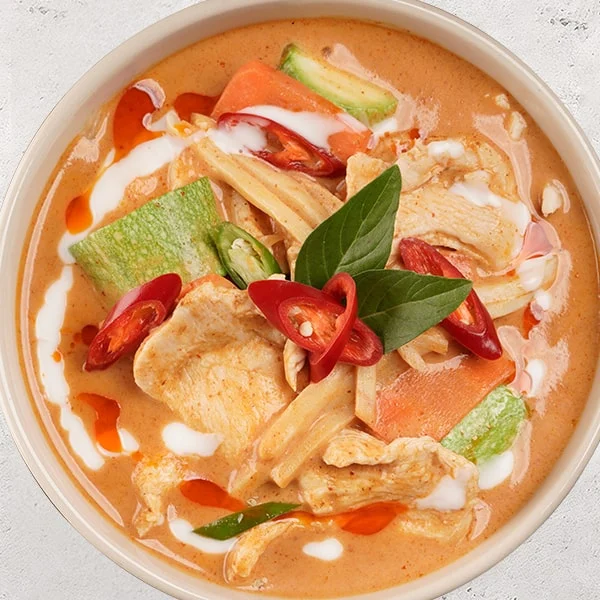Your choice of meat or vegetables simmered in a classic green curry, with baby marrow, chili, kaffir lime leaves, and sweet basil