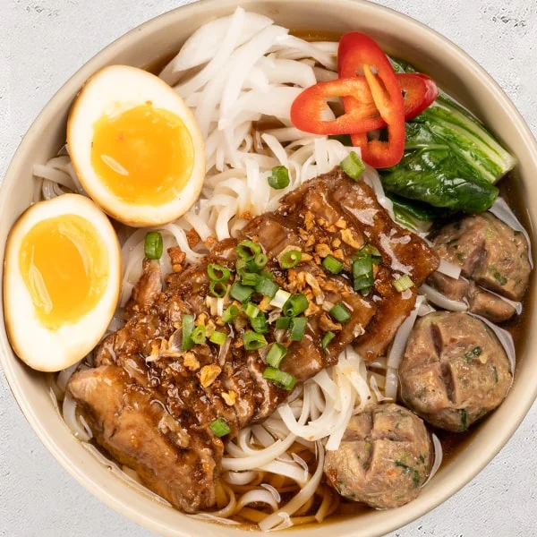 Braised AUS beef with rice noodles, beef balls, and boiled egg