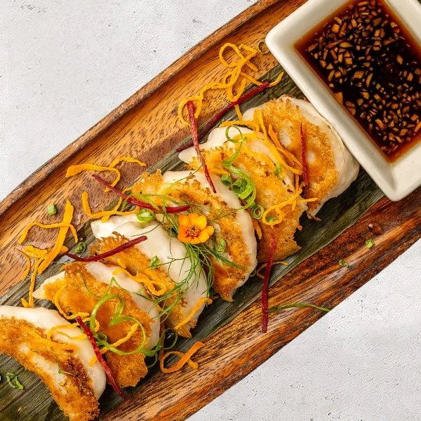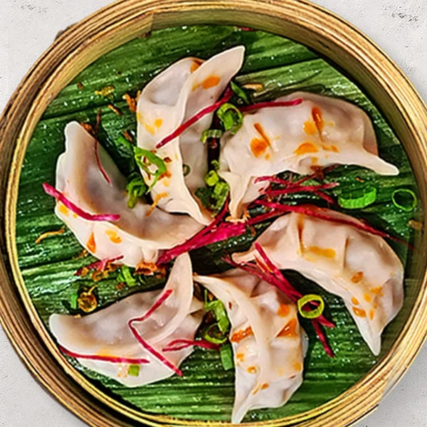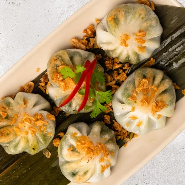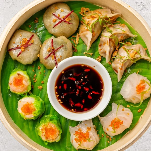 هارغاو سي فود مطهو على البخار وشوماي روبيان تُقدّم مع صلصة ديم سوم ومعجون الفلفل الحار