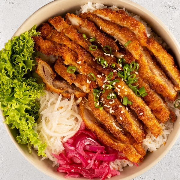 Crispy fried chicken on steamed rice drizzled with aromatic soya sauce