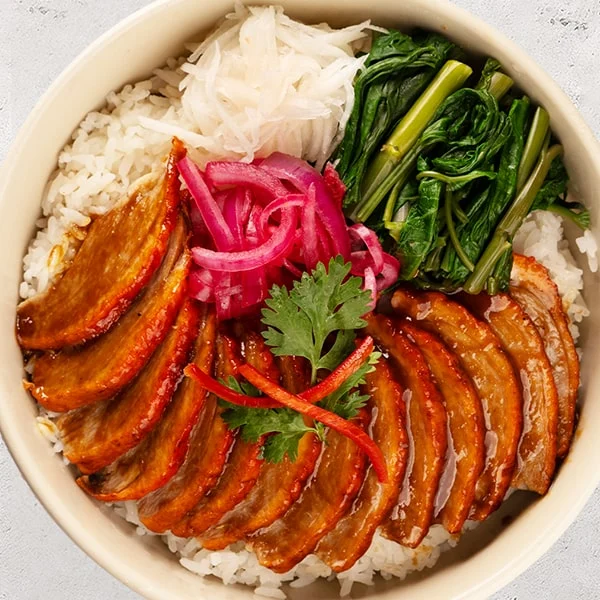 بط مشوي عطري على أرز مطهو على البخار مع صلصة صويا حارة