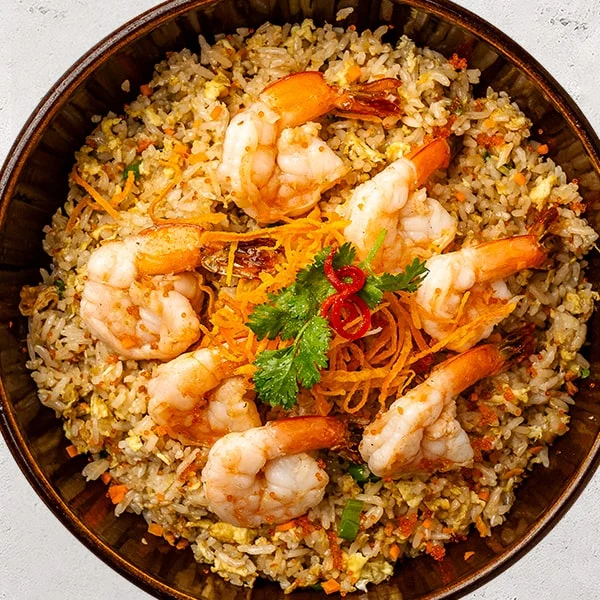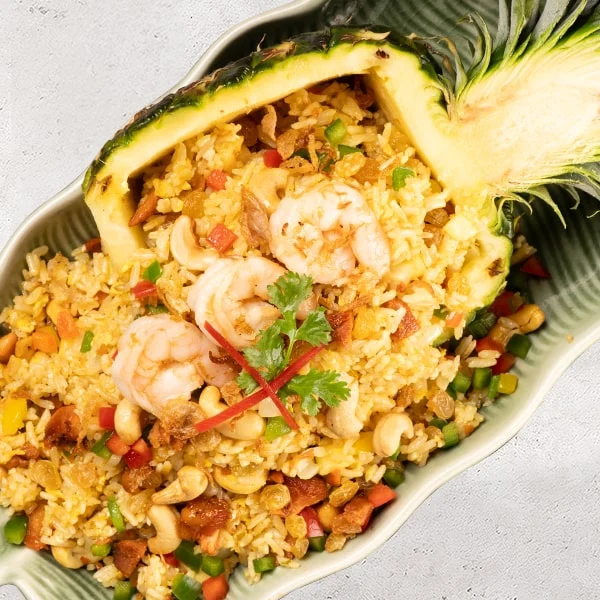 Fried rice with shrimps, grilled chicken, cashew nuts, and raisins, served in a pineapple