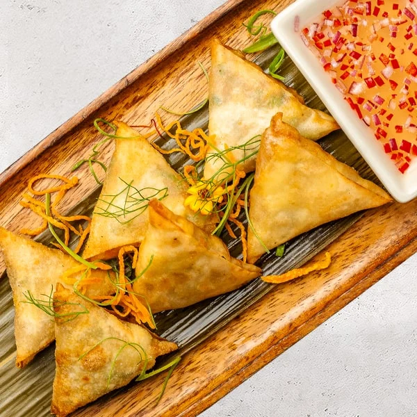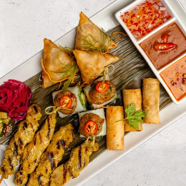 Chicken satay, vegetable spring rolls, crispy crab & prawn pouches and garden salad rolls