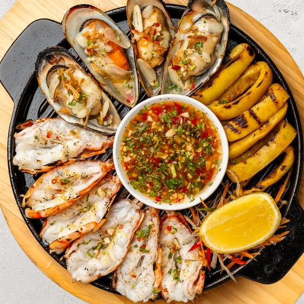 Grilled prawns, squid and mussels with cheese, served with spicy seafood dip