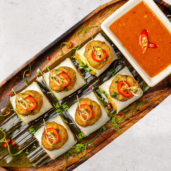 ساتيه دجاج ورولز خضار وأكياس مقرمشة محشوة بالسلطعون والروبيان ولفائف سلطة خضراء