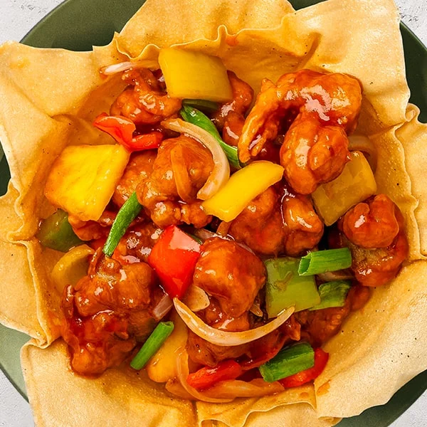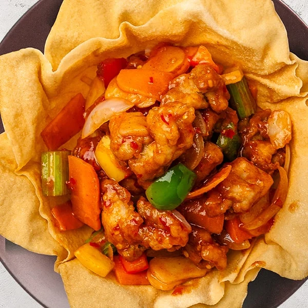 دجاج مقرمش أو روبيان أو لحم واغيو بالزبدة والثوم وكستناء الماء وصلصة الفلفل الحار