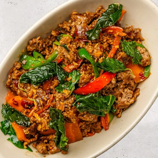 اختيارك من اللحم المفروم أو التوفو مع الثوم والفلفل الحار والريحان التايلاندي