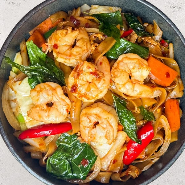Flat rice noodles with meat or vegetables, stir-fried in soya sauce, garlic, chili, and Thai basil