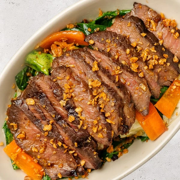 شرائح ستيك بقر أسترالي مقلية تُقدّم مع خضار مشكل مقلي ومغطي بالثوم