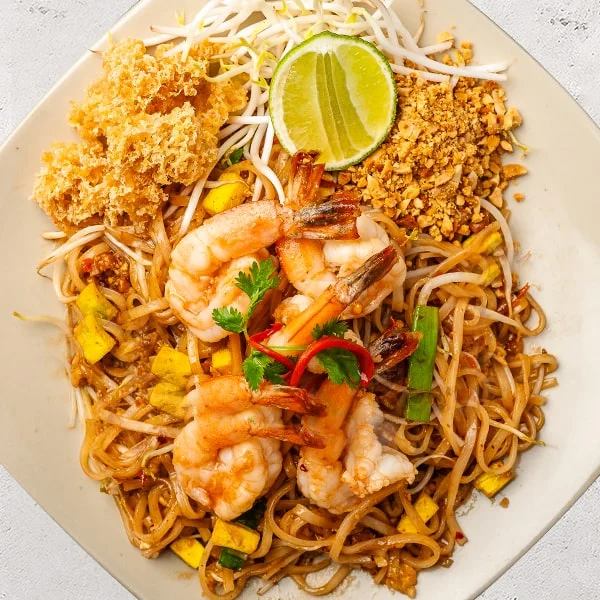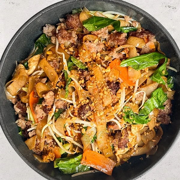 نودلز الأرز مع اختيار اللحوم أو الخضروات، مقلية في صلصة التمر الهندي الحلوة، التوفو، الروبيان المجفف ومزينة ببراعم الفاصوليا والفول السوداني المحمص