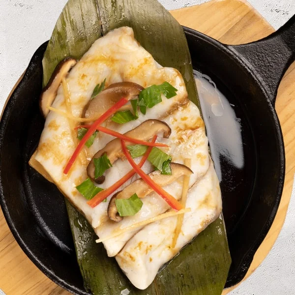 سمك قاروص مطهو على البخار مع الزنجبيل ورشة من صلصة الصويا الخفيفة
