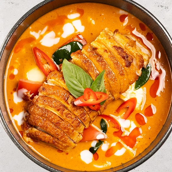 Grilled duck slices with pineapple and tomato simmered in red curry sauce