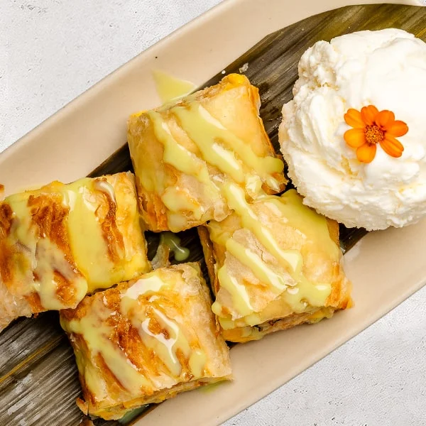 موز مقلي يُقدّم مع آيس كريم الفانيليا والعسل