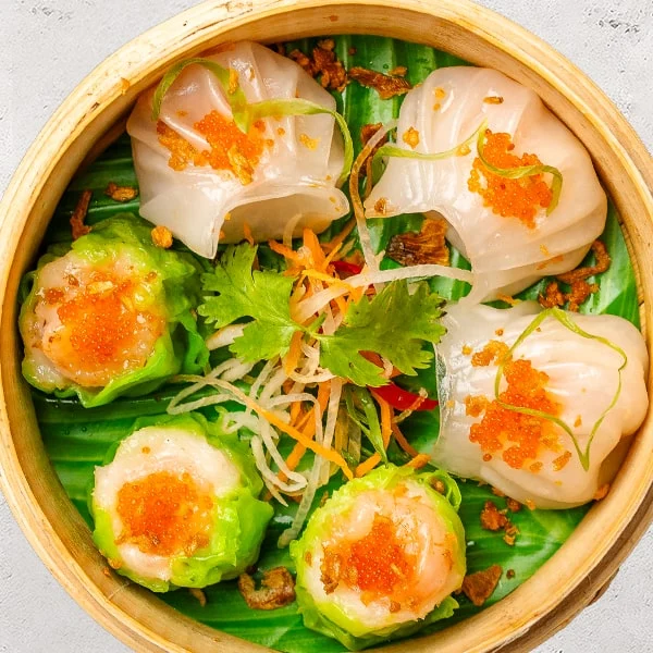Steamed seafood hargao and prawns sui mai served with dim sum sauce and chili paste