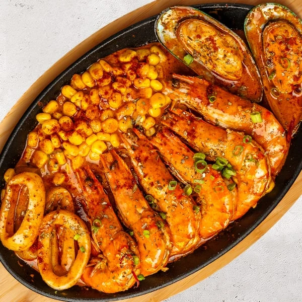 روبيان وحبار وبلح بحر مشوي مع الجبن يُقدّم مع صلصة سي فود حارة