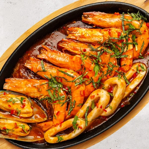 Stir fried prawns, mussels, and squid with sweet basil, in spicy szechuan sauce