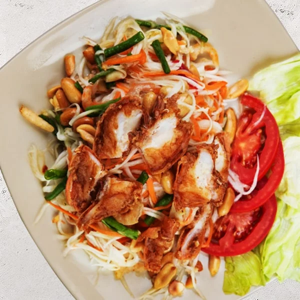 Famous green papaya salad with crispy prawns or crispy soya bean with peanuts