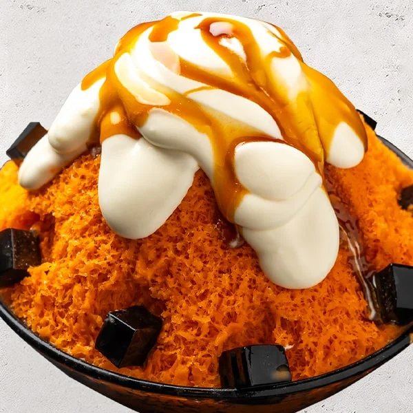 Finely shaved Thai tea flavored ice with black jelly and caramel sauce
