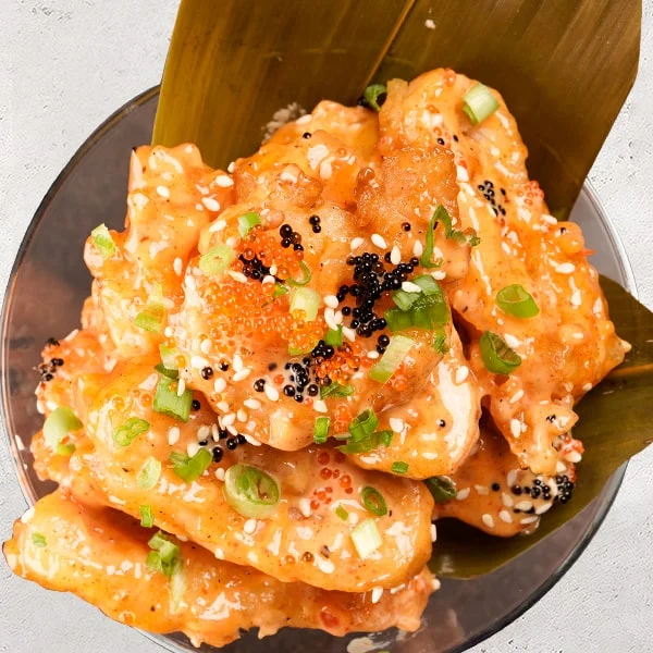 روبيان مقلي مع حلقات حبار أو توفو ممزوج بصلصة المايونيز وسريراتشا الحارة