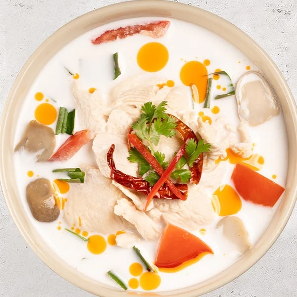 spicy and sour coconut soup with chicken, mushroom, and galangal