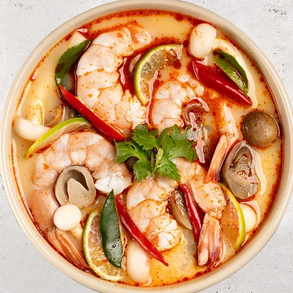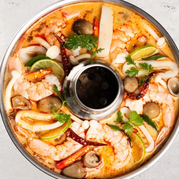 Good for up to four people. Hot and spicy soup with prawns, squids, mushrooms and fragrant herbs