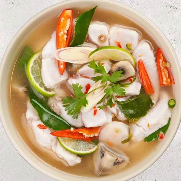 Hot and spicy clear soup with seabass fillet with mushroom and Thai herbs