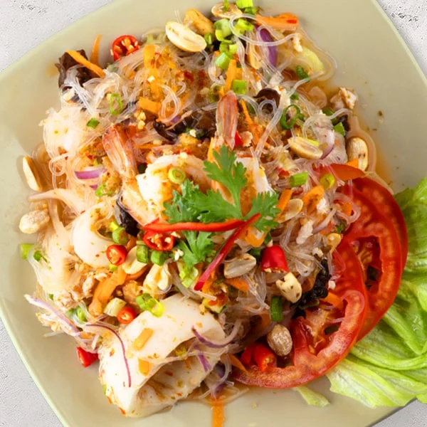 سلطة نودلز زجاجية مع روبيان وحبار ودجاج مفروم أو خضار وفول سوداني بصلصة تايلاندية حارة